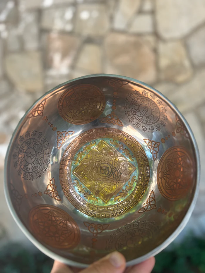 Elevate your sound healing practice with The Crown Jewel - A 10.25" handmade etched bronze singing bowl of exceptional beauty and tone. Intricately hand-etched and crafted from high-quality bronze, it produces rich, harmonic vibrations ideal for meditation, chakra balancing, and ceremonial use.